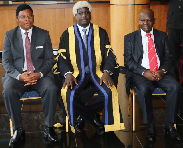 Waziri Mkuu, Kassim Majaliwa na Spika wa Bunge Job Ndugai wakiwa katika picha ya pamoja na Spikia wa Bunge la Afrika ya Mashariki, Daniel Fredrick Kadega (katikati) baada ya kuhutubia Mkutano wa  Tano wa Bunge la Afrika ya Mashariki kwenye ukumbi wa Benki Kuu jijini Dar es salaam.