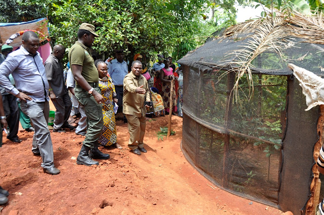 Waziri wa Maliasili na Utalii, Dk. Hamisi Kigwangalla akiangalia vipepeo katika moja shamba la wafugaji katika Tarafa ya Amani Jijini Tanga jana. Mbali na biashara ya kuuza vipepeo hao nje ya nchi aliwataka wafugaji hao kutumia fursa ya ufugaji huo kama bidhaa ya utalii kwa kuandaa maonesho maalum ya kuwavutia watalii wanaotembelea Hifadhi ya Mazingira Asilia Amani