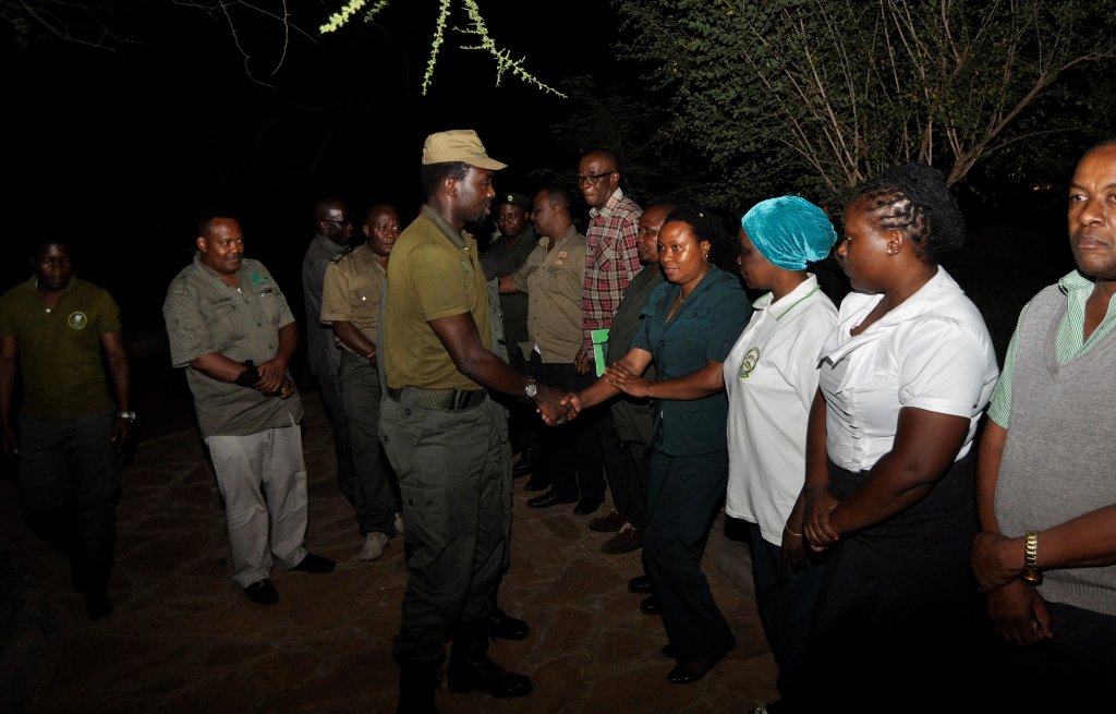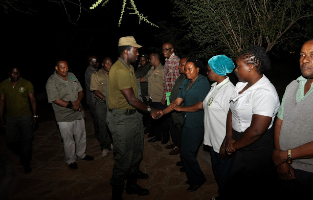 Waziri wa Maliasili na Utalii, Dk. Hamisi Kigwangalla akisalimiana na wafanyakazi wa Hifadhi ya Taifa Mkomazi alipotembelea hifadhi hiyo jana mkoani Tanga.