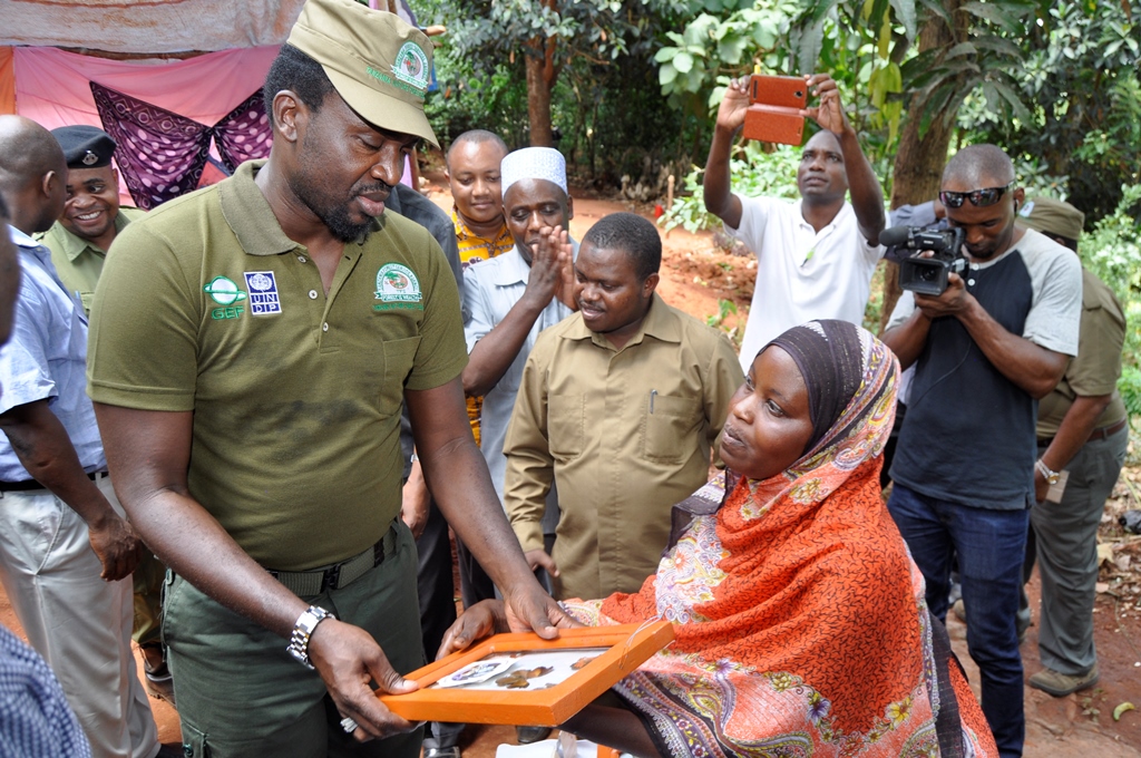Waziri wa Maliasili na Utalii, Dk. Hamisi Kigwangalla akimkabidhi Asha Shaban ambaye ni dada yake na Shaban Robert aliyekuwa mshairi na mwandishi mashuhuri wa riwaya zawadi ya asali inayozalishwa na Wakala wa Huduma za Misitu Tanzania TFS kupitia shamba la Miti Sao Hill alipotembelea makumbusho ya mwandishi huyo Jijini Tanga jana.