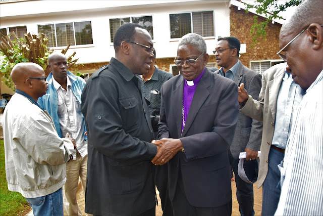 Mwenyekiti wa Chadema Taifa  na Kiongozi  wa kambi rasmi Bungeni ,Freeman Ndesamburo akisalimiana na Askofu wa KKKT Dkt Martin Shoo alipofika nyumbani kwa marehemu Dkt Ndesamburo .