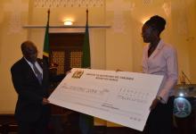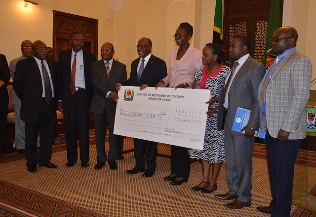 Rais Dkt. John Pombe Magufuli akiwa na Naibu Spika Dkt. Tulia Ackson kulia, Katibu wa Bunge Dkt. Thomas Kashilillah pamoja na wafanyakazi wengine wa Bunge wakiwa wameishika hundi Kifani hiyo yenye thamani ya Shilingi Bilioni Sita. Rais Dkt. Magufuli ameipongeza Taasisi ya Bunge kutokana na hatua hiyo ya kubana matumizi na kuamua fedha zao zitumike katika kununulia madawati kwa ajili ya wanafunzi.