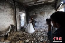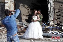 Wanandoa Hassan Youssef na Nada Merhi wakipigwa picha mbele ya majengo yaliyoharibiwa na vita.