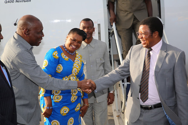 Waziri Mkuu, Kassim Majaliwa akisalimiana na Mkuu wa Mkoa wa Dodoma, Jordan Rugimbana baada ya kuwasili kwenye uwanja wa ndege wa Dodoma akitoka uwanja wa ndege wa Julius Kambarage Nyerere jijini Dar es salaam ikiwa ni uzinduzi wa safari za ndege za Shirika la Ndege la Tanzania (ATCL) kati ya viwanja viwili hivyo, Januari 16, 2016. Wapili kushoto ni Waziri wa Nchi, Ofisi ya Waziri Mkuu, Sera, Bunge, Kazi, Vijan, Ajira na Watu Wenye Ulemavu, Jenista Mhagama.