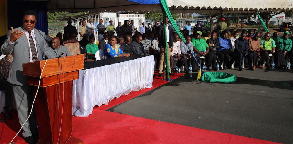 Mkuu wa Mkoa wa Dodoma, Jordan Rugimbana akizungumza katika uzinduzi wa safari za ndege za ATCL kati ya Uwnja wa Julius Kambarage Nyerere na Dodoma,mjini Dodoma Januari 16, 2017. Uzinduzi huo ulifanywa na Waziri Mkuu, Kassim Majaliwa kwenye uwanja wa ndege wa Dodoma .
