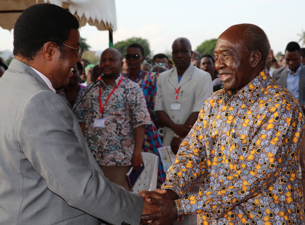 Waziri Mkuu, Kassim Majaliwa akisalimiana na Waziri Mkuu Mstaafu, John Malecela baada ya kuwasili kwenye uwanja wa ndege wa Dodoma akitoka uwanja wa ndege wa Julius Nyerere jijini Dar es salaam ikiwa ni uzinduzi wa safari za ndege za ATCL kati aya viwanja viwili hivyo, Januari 16, 2017.