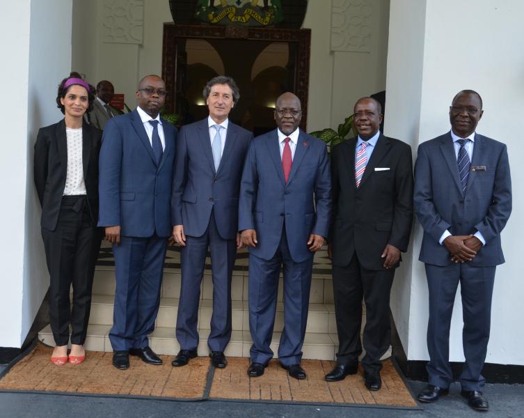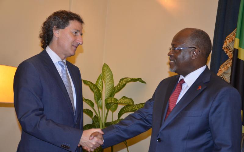Rais wa Jamhuri ya Muungano wa Tanzania Dkt. John Pombe Magufuli akiwa katika picha ya pamoja na Makamu wa Rais wa Kampuni ya Total Afrika Mashariki, Javier Rielo