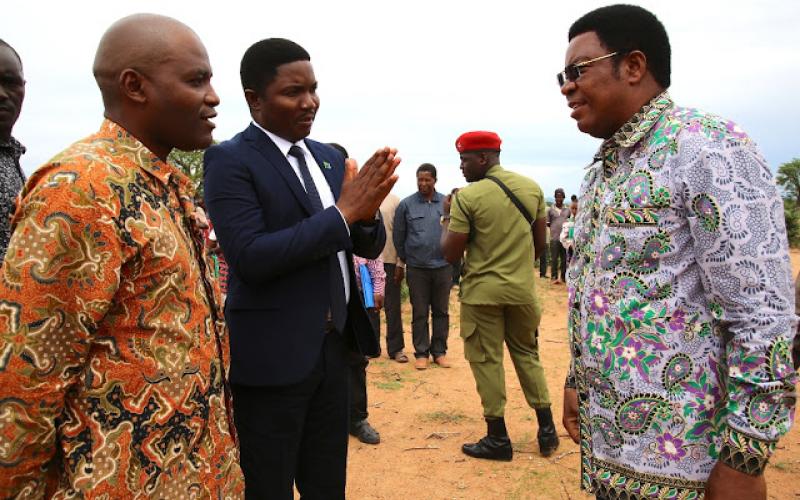 Waziri Mkuu, Kassim Majaliwa akizungumza na Waziri wa Nchi, Ofisi ya Rais, Tawala za Mikoa na Serikali za Mitaa, Selemani Jafo (katikati) na Naibu Waziri wa Afya, Maendeleo ya Jamii, Jinsia, Wazee na Watoto, Faustine Ndugulile wakati alipokagua eneo itakapojengwa  Hospitali ya Uhuru katika kijiji cha Maduma wilayani Chamwino, Januari 18, 2019.