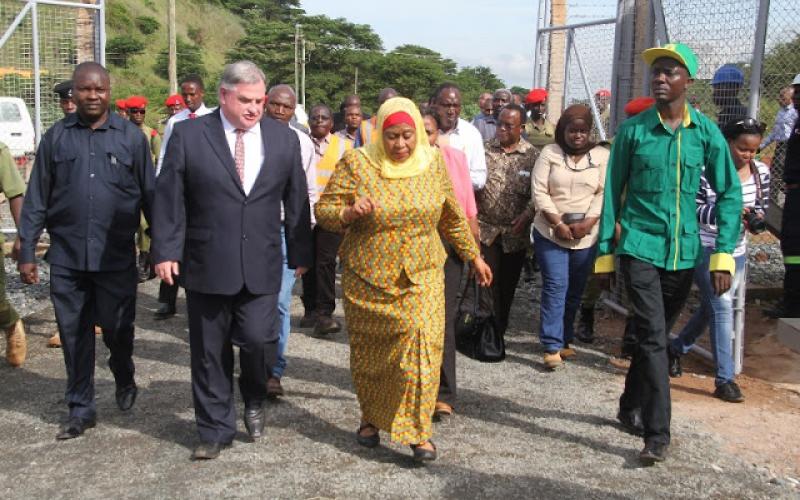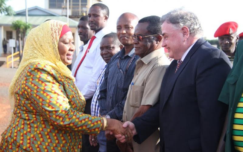 07 January 2016 | Tanzania Makamu wa Rais wa Jamhuri ya Muungano wa Tanzania Mhe. Samia Suluhu Hassan, akiagana na Mkurugenzi Mkuu wa Kampuni ya Geita Gold Mining Terry Melpeter kwenye Uwanja wa Ndege wa GGM Geita baada ya kukamilisha ziara ya siku mbili ya kukagua na kuzindua miradi ya maendeleo ya wananchi Mkoani humo leo.
