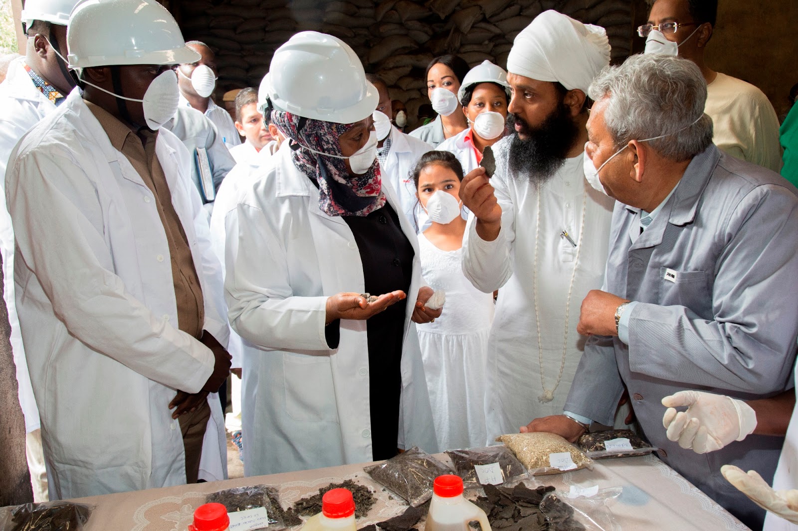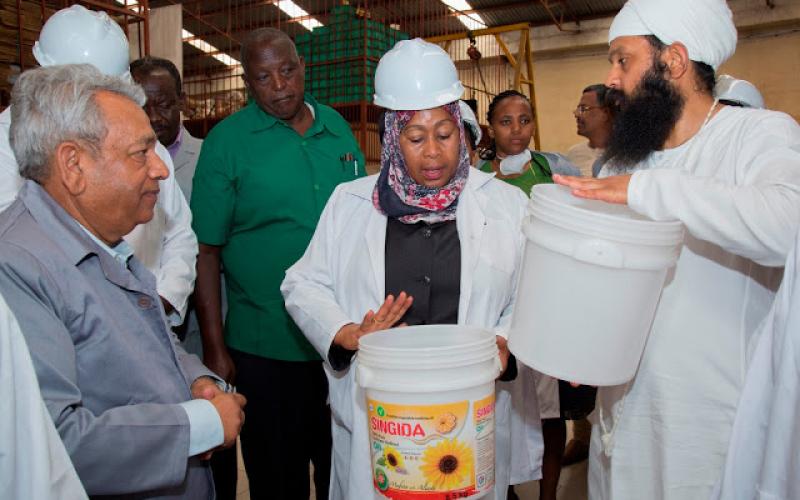 Makamu wa Rais wa Jamhuri ya Muungano wa Tanzania Mhe. Samia Suluhu Hassan akiangalia malighafi zinazotumika kuzalishia mafuta ya kupikia kutoka kiwanda cha Mt. Meru Miller mjini Arusha.