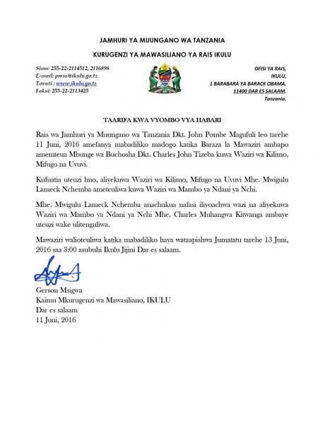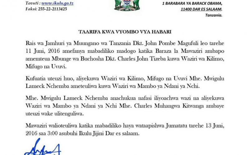 11 June 2016 | Tanzania Rais John Pombe Magufuli kumteua mbunge wa Buchosa Dk Charles John Tizebe kuwa waziri wa kilimo na mifugo na kumuhamisha waziri Mwigulu Nchemba kuwa waziri wa mambo ya ndani ya nchi.