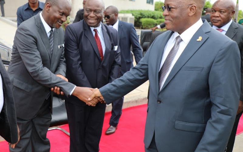 Rais wa Jamhuri ya Muungano wa Tanzania Dkt. John Pombe Magufuli akipeana mikono na Askofu Mkuu wa Kanisa la Full Gospel Bible Fellowship (FGBF) Zacharia Kakobe katika hafla ya makabidhiano ya Mfumo wa Kudhibiti Mawasiliano ya Ndani na Nje ya Nchi (TTMS) iliyofanyika makao Makuu ya TCRA Jijini Dar es salaam leo Januari 18, 2019.