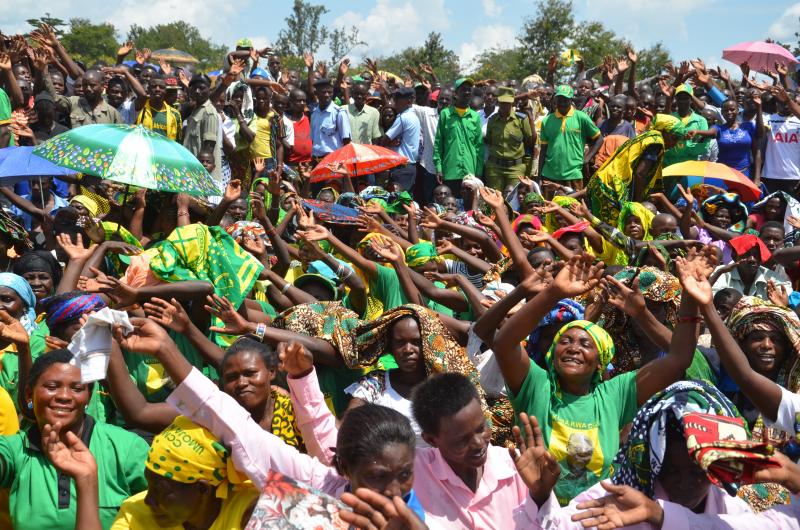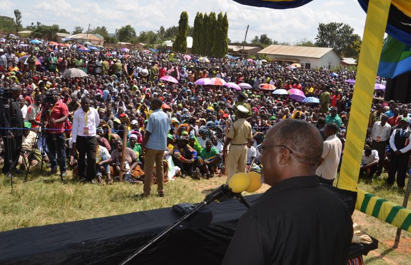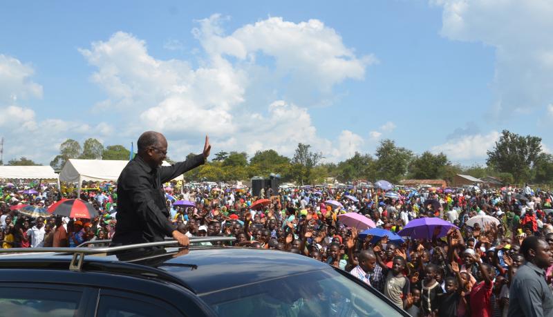 30 March 2016 | Tanzania Rais wa Jamhuri ya Muungano wa Tanzania Dkt. John Pombe Magufuli amefika nyumbani kwake katika kijiji cha Mlimani, Wilaya ya Chato Mkoani Geita kwa mara ya kwanza tangu achaguliwe kuwa Rais, ambapo akizungumza na wananchi katika Mkutano wa hadhara uliofanyika katika uwanja wa shule ya sekondari Chato, ametoa wito kwa kila mtanzania kuchapa kazi kwa juhudi ili nchi iondokane na utegemezi wa misaada ya wafadhili ambayo huambatana na masharti.