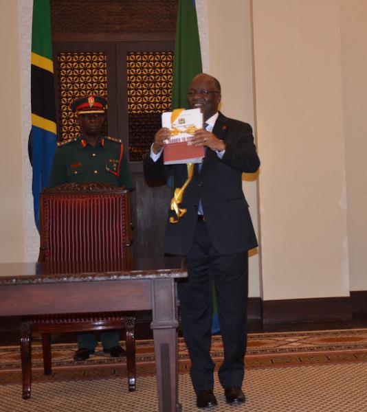 Rais Dkt. John Pombe Magufuli akiwa ameishika Taarifa ya Mwaka ya utendaji wa Taasisi ya Kuzuia na Kupambana na Rushwa (TAKUKURU) mara baada ya kukabidhiwa na Mkurugenzi Mkuu wa Taasisi hiyo Kamishna Valentino Mlowola Ikulu jijini Dar es Salaam.