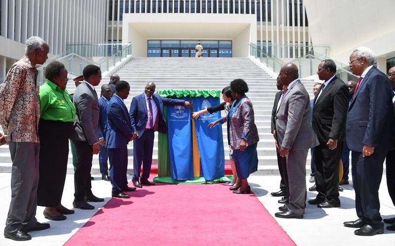 Rais wa Jamhuri ya Muungano wa Tanzania Dkt. John Pombe Magufuli akivuta utepe pamoja na Balozi wa China hapa nchini Wang Ke kuashiria ufunguzi wa Maktaba mpya ya Chuo Kikuu cha Dar es Salaam yenye uwezo wa kuchukua wanafunzi 2100 kwa wakati mmoja. Wengine katika picha wanaoshuhudia ni Waziri Mkuu mstaafu Jaji Joseph Warioba, Waziri Mkuu Mstaafu Edward Lowassa, Mwenyekiti wa CCM mkoa wa Dar es Salaam Mama Kate Kamba, Waziri wa Katiba na Sheria Profesa Palamagamba Kabudi, Waziri wa Elimu Profesa Joyce Ndalichako pamoja na Makamu Mkuu wa Chuo cha Dar es Salaam Profesa William Anangisye