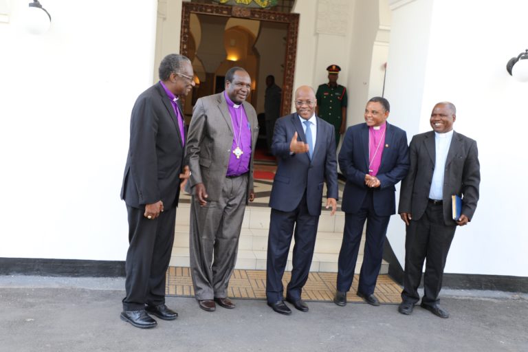 Rais wa Jamhuri ya Tanzania Dkt. John Pombe Magufuli akiwa na Mwenyekiti wa Jumuiya ya Kikristo Tanzania (CCT) ambaye pia ni Askofu Mkuu wa Kanisa la Moravian Tanzania, Alinikisya Cheyo, Makamu Mwenyekiti wa Kwanza wa Jumuiya hiyo Dkt. Frederick Shoo, Makamu wa Pili wa Mwenyekiti Dkt Jacob Chimeleje na Katibu Mkuu wa CCT Canon Moses Matonya baada ya ujumbe wa viongozi hao kumtembelea na kujitambulisha kwake Ikulu jijini Dar es salaam leo Agosti 7, 2018.