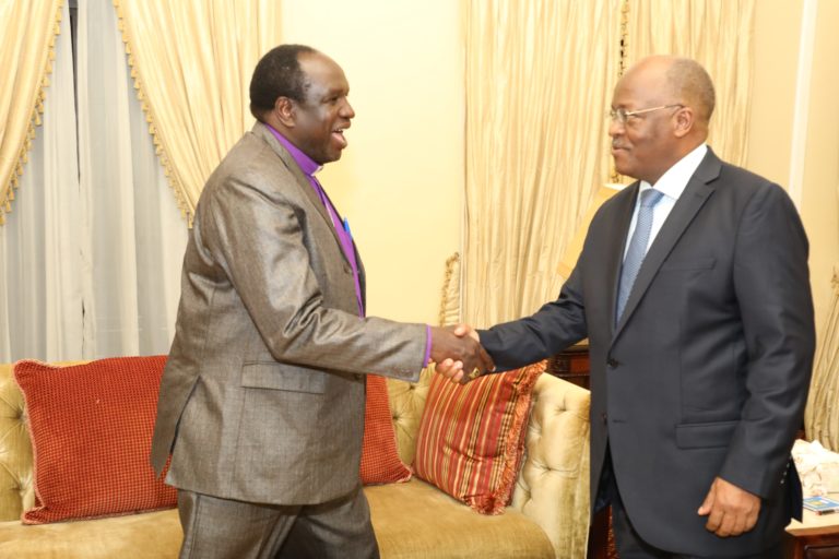 Rais wa Jamhuri ya Tanzania Dkt. John Pombe Magufuli akisalimiana na Mwenyekiti wa Jumuiya ya Kikristo Tanzania (CCT) ambaye pia ni Askofu Mkuu wa Kanisa la Moravian Tanzania Jimbo la Kusini Magharibi Alinikisya Cheyo, aliyeongoza ujumbe wa viongozi wapya wa Jumuiya hiyo kumtembelea na kujitambulisha kwake Ikulu jijini Dar es salaam leo Agosti 7, 2018.