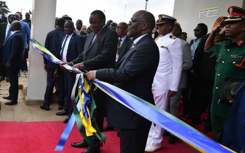 Rais wa Jamhuri ya Muungano wa Tanzania Dkt. John Pombe Magufuli akiwa na Rais wa Kenya Uhuru Kenyatta wakati wakikata utepe kuashiria ufunguzi wa Kituo cha Kutoa huduma kwa pamoja mpakani Namanga One Stop Border Post (OSBP) upande wa Tanzania.