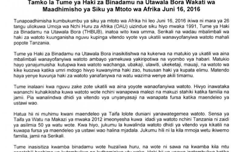 Tamko la THBUB Siku ya Mtoto wa Afrika Juni 16, 2016