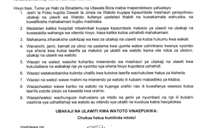Wananchi, jamii, kamati za ulinzi na usalama kwa ujumla watoe ushirikiano kwenye vyombo vya sheria kwa kutoa taarifa za matukio ya ukatili wa watoto kama vile ndoa za utotoni, ubakaji na ulawiti wa watoto.