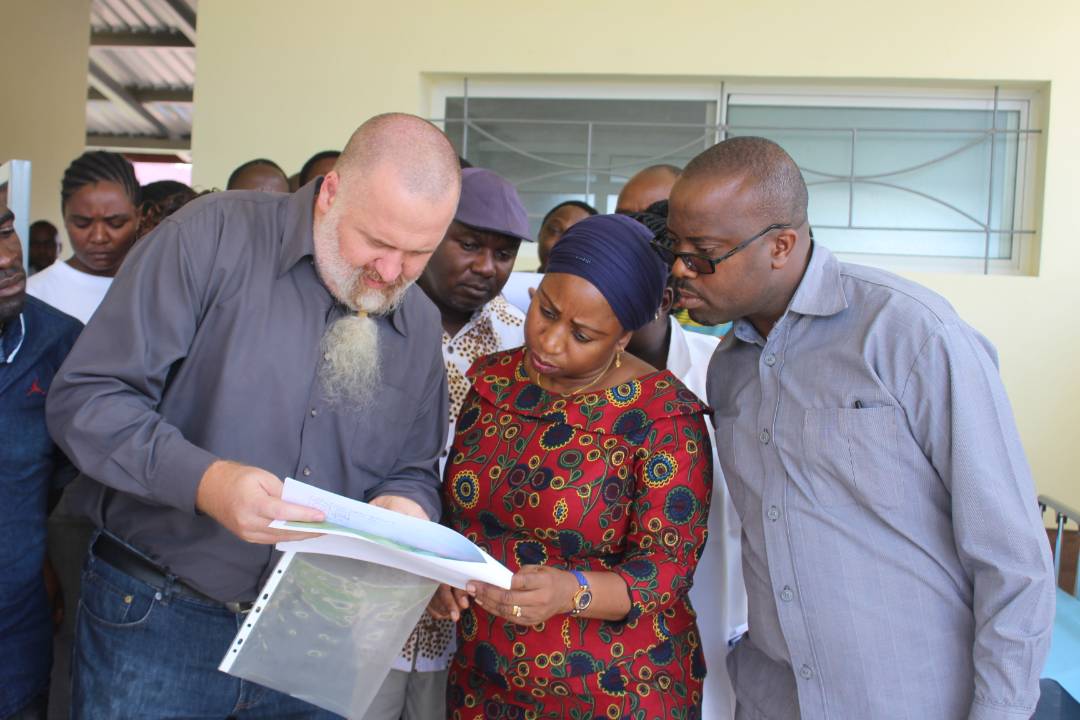 Waziri ummy Mwalimu akiangalia ramani ya kituo hicho cha afya ambacho kimejengwa kwa ushirikiano wa Halmashauri ya Wilaya ya Sengerema na Shirika la SEDA Foundation, kulia ni Mganga Mkuu wa Mkoa wa Mwanza Dkt.Subi na kushoto ni mmoja wa Viongozi wa Shirika hilo.