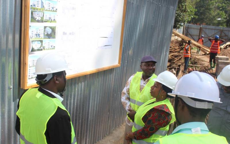 Waziri Ummy Mwalimu akiangalia Ramani ya Ujenzi wa jengo la ghorofa nne la Uzazi linalojengwa hospitali ya Mkoa ya Sekoture jijini Mwanza.