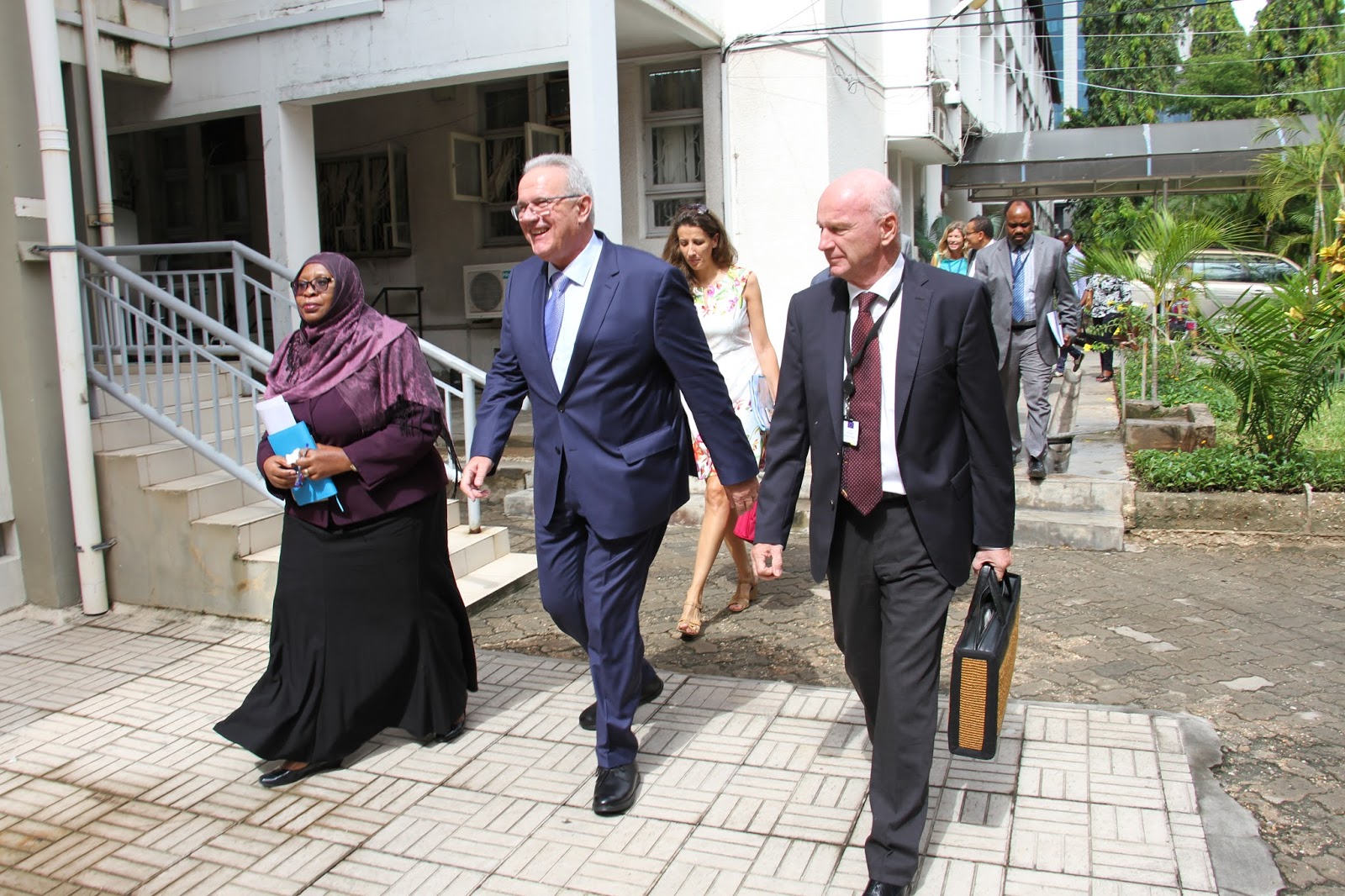 03 November 2017 | Tanzania Naibu Katibu Mkuu wa Wizara ya Fedha na Mipango Bi Amina Shaban (kushoto) akiupokea ujumbe kutoka Umoja wa Ulaya, ukiongozwa na Kamishna wa Ushirikiano wa Kimataifa na Maendeleo Bw. Neven Mimica (katikati) na Balozi wa Umoja wa Ulaya nchini Tanzania Bw. Roeland van de Geer, walipokuwa wanawasili Wizara ya Fedha na Mipango, Jijini Dar es Salaam kwa ajili ya kutoa msaada wa Euro milioni 50 kwa Tanzania.