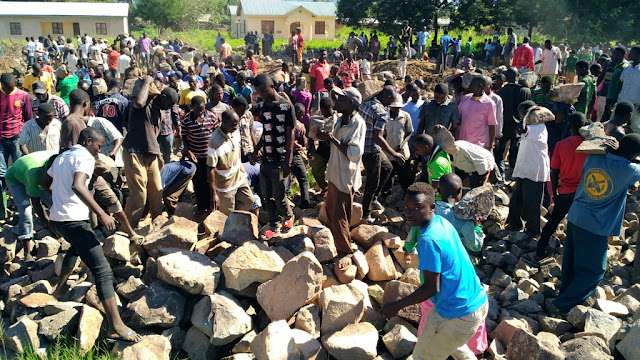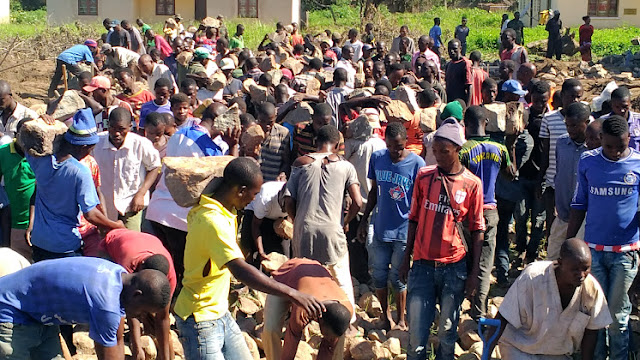 Mkuu wa Mkoa wa Rukwa Mh. Joachim Wangabo (wa pili kutoka kushoto) akipokezana na wananchi mawe ya msingi yanayojengewa msingi wa kituo cha afya cha kirando siku ya uzinduzi wa songambele ya upanuzi wa ujenzi wa kituo hicho.