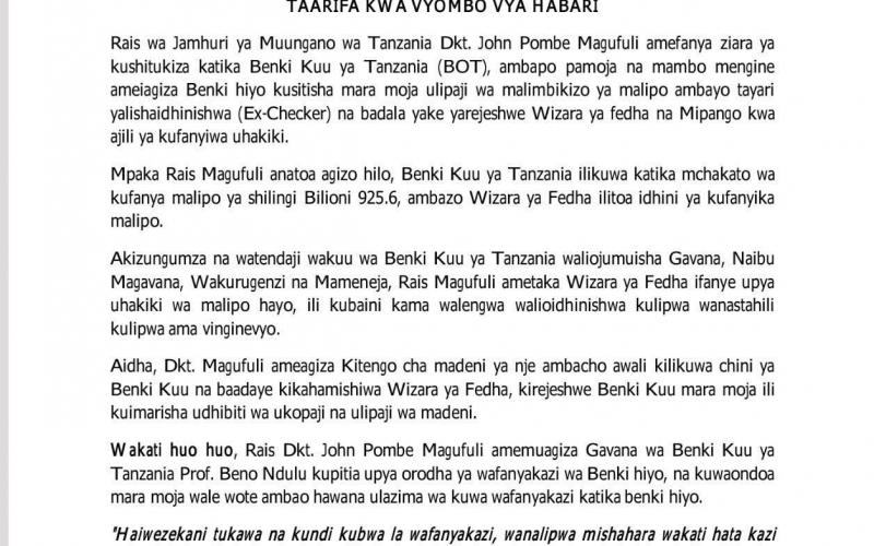 Rais Dkt John Pombe Joseph Magufuli amemuagiza Gavana wa BOT Prof. Beno Ndulu kupia upya orodha ya wafanyakazi 1,391 na kuwaondoa ambao hawana ulazima wa kuwepo BOT.